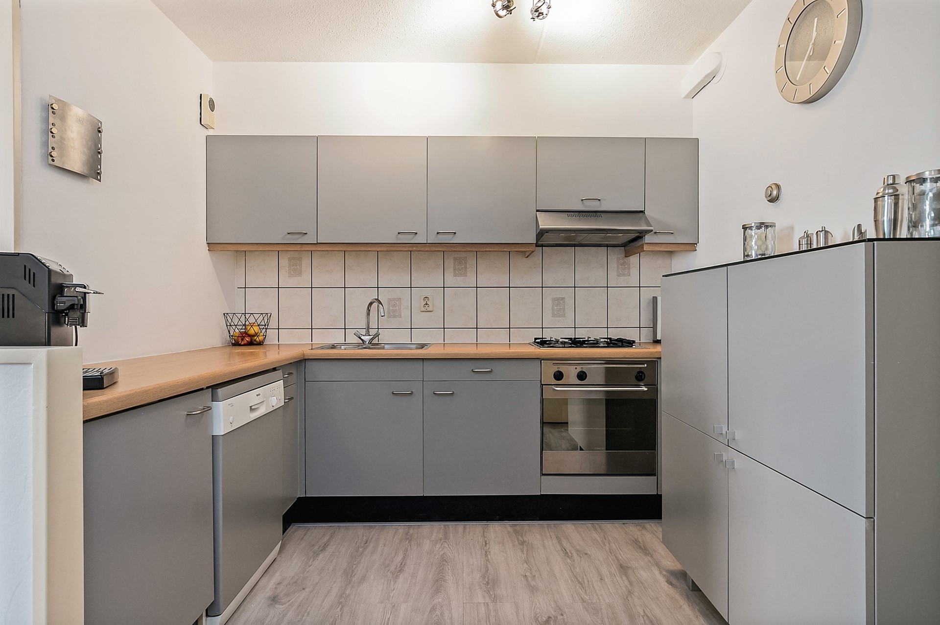 De keuken is voorzien van de volgende apparatuur ; gaskookplaat, oven, afzuiging, vaatwasser, koelkast.