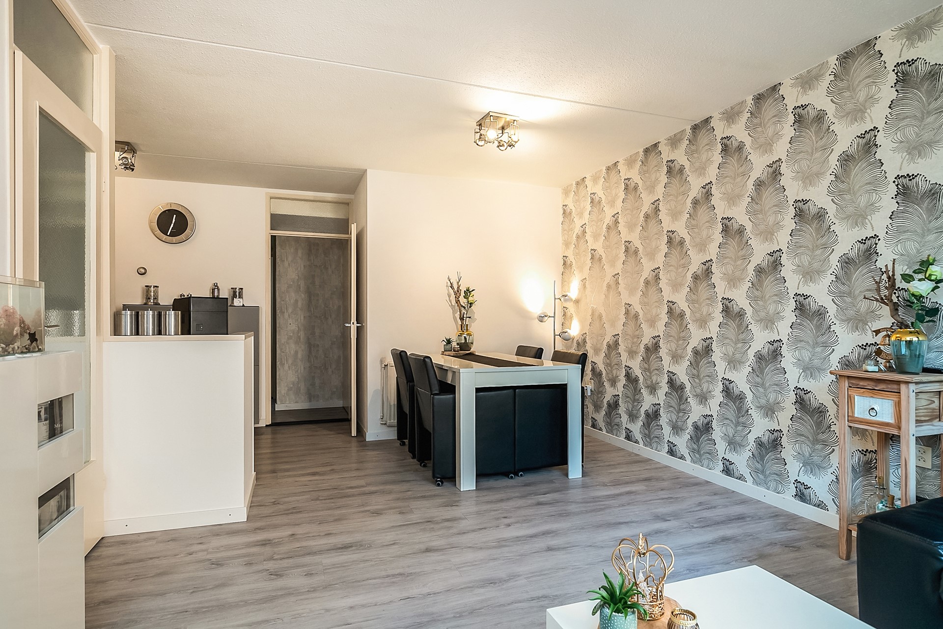 Sfeervolle living met open moderne keuken geheel afgewerkt met laminaatvloer.