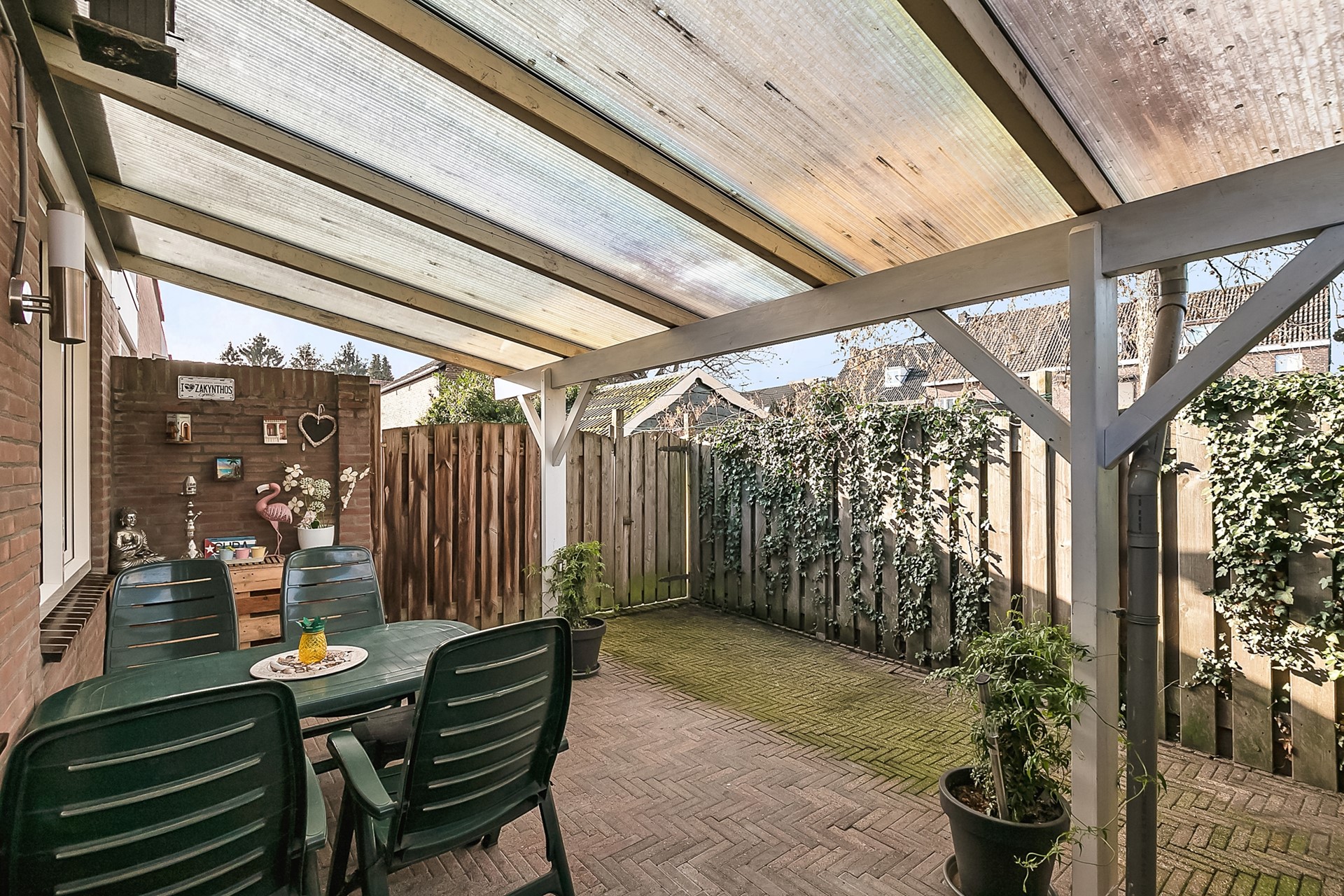 Geheel omsloten onderhoudsvriendelijke tuin met terrasoverkapping en achterom.