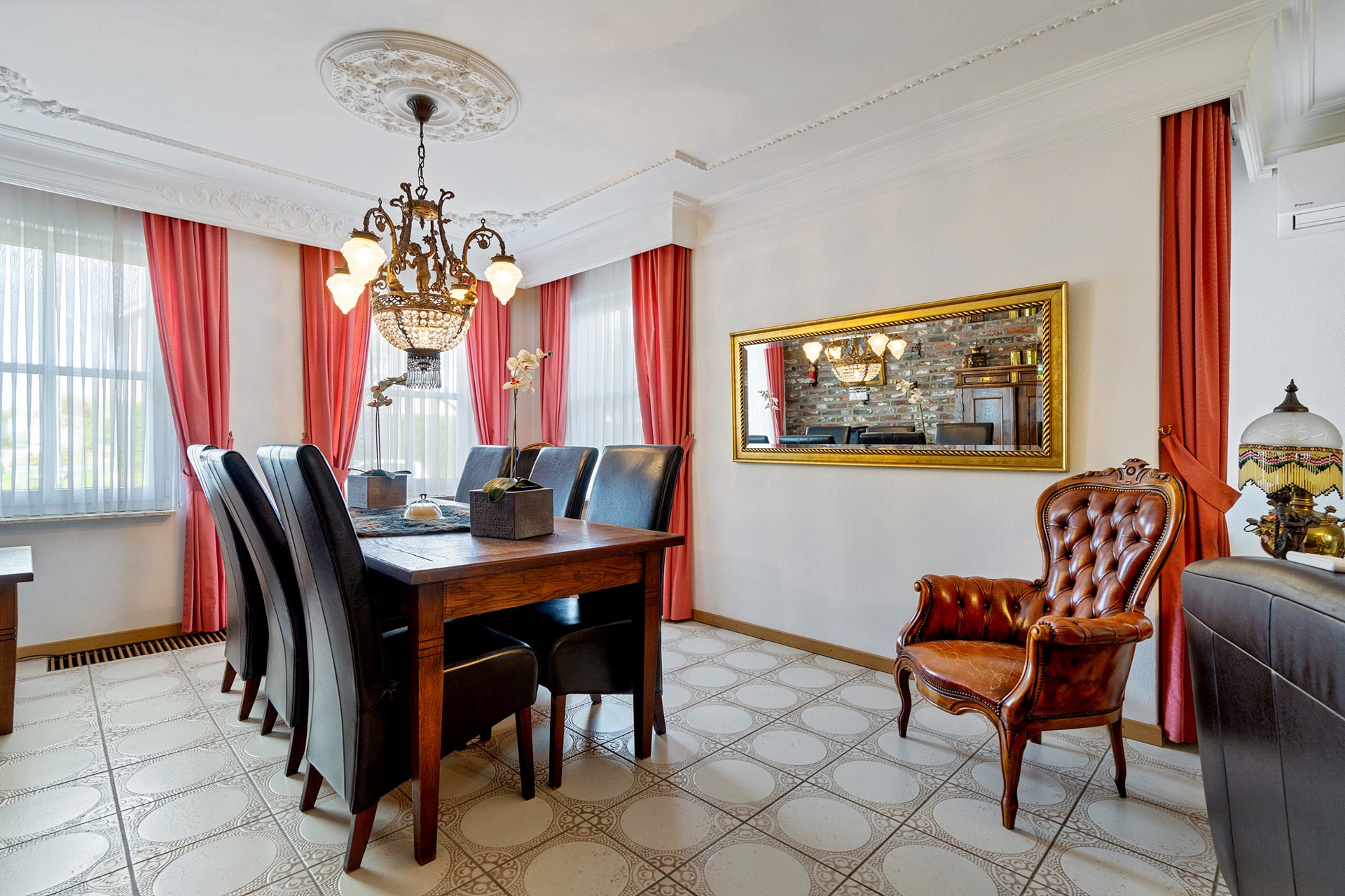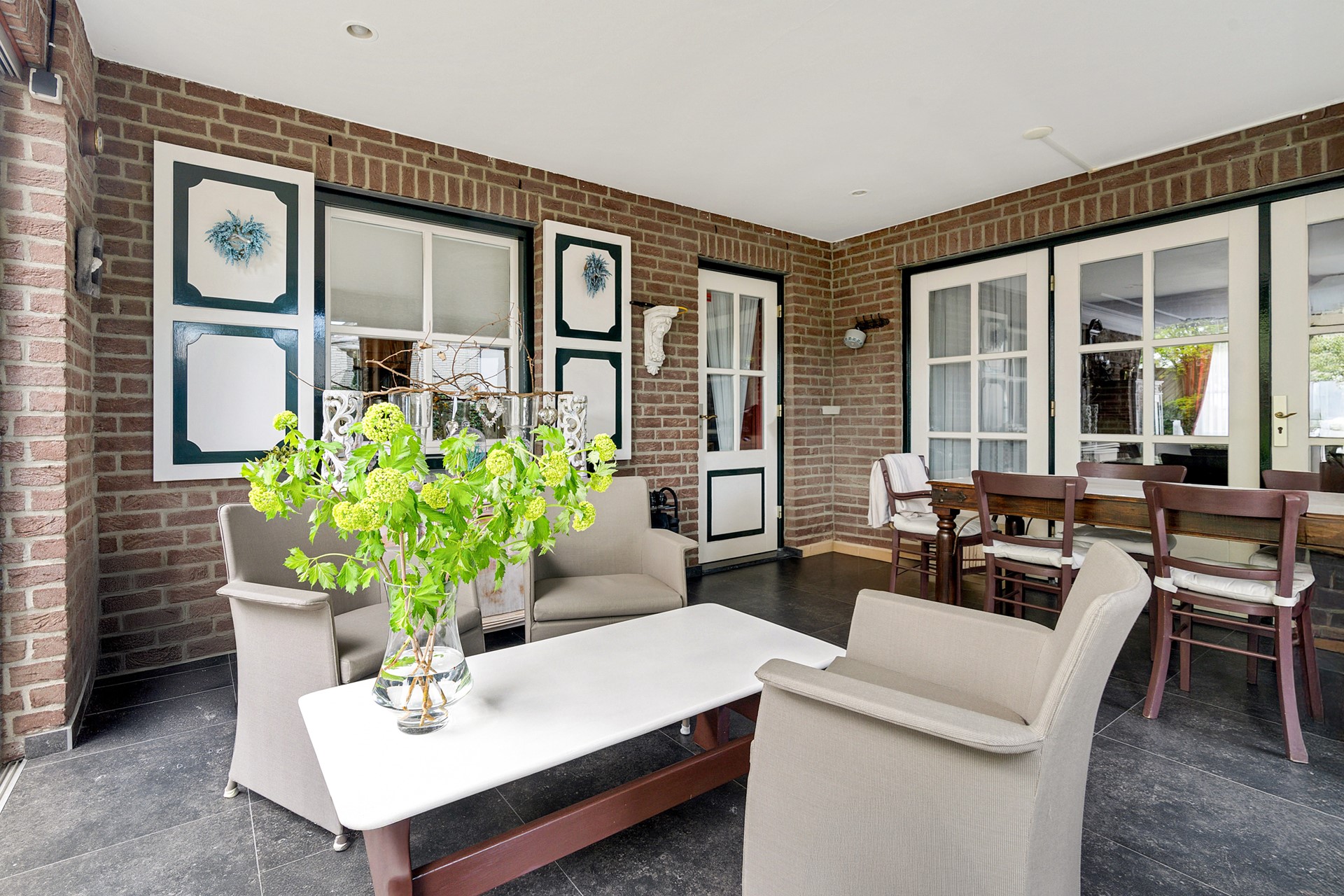 - Royale L-woonkamer(9.08mx3.22mx8.63mx3.76m) airco, tegelvloer, mooi tuincontact naar serre(4.94mx4.84m), terras en tuin.