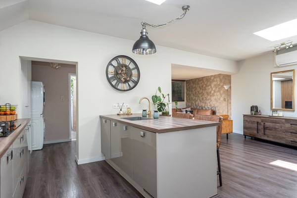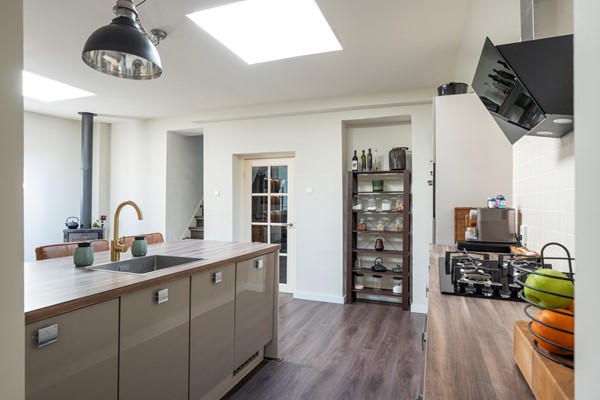 Bij binnenkomst treed je in een sfeervolle hal/voorkamer die multifunctioneel gebruikt kan worden. De keuken met kookeiland is voorzien van diverse inbouwapparatuur waaronder: gasfornuis, oven, vaatwasser en een koelvries-combinatie.
