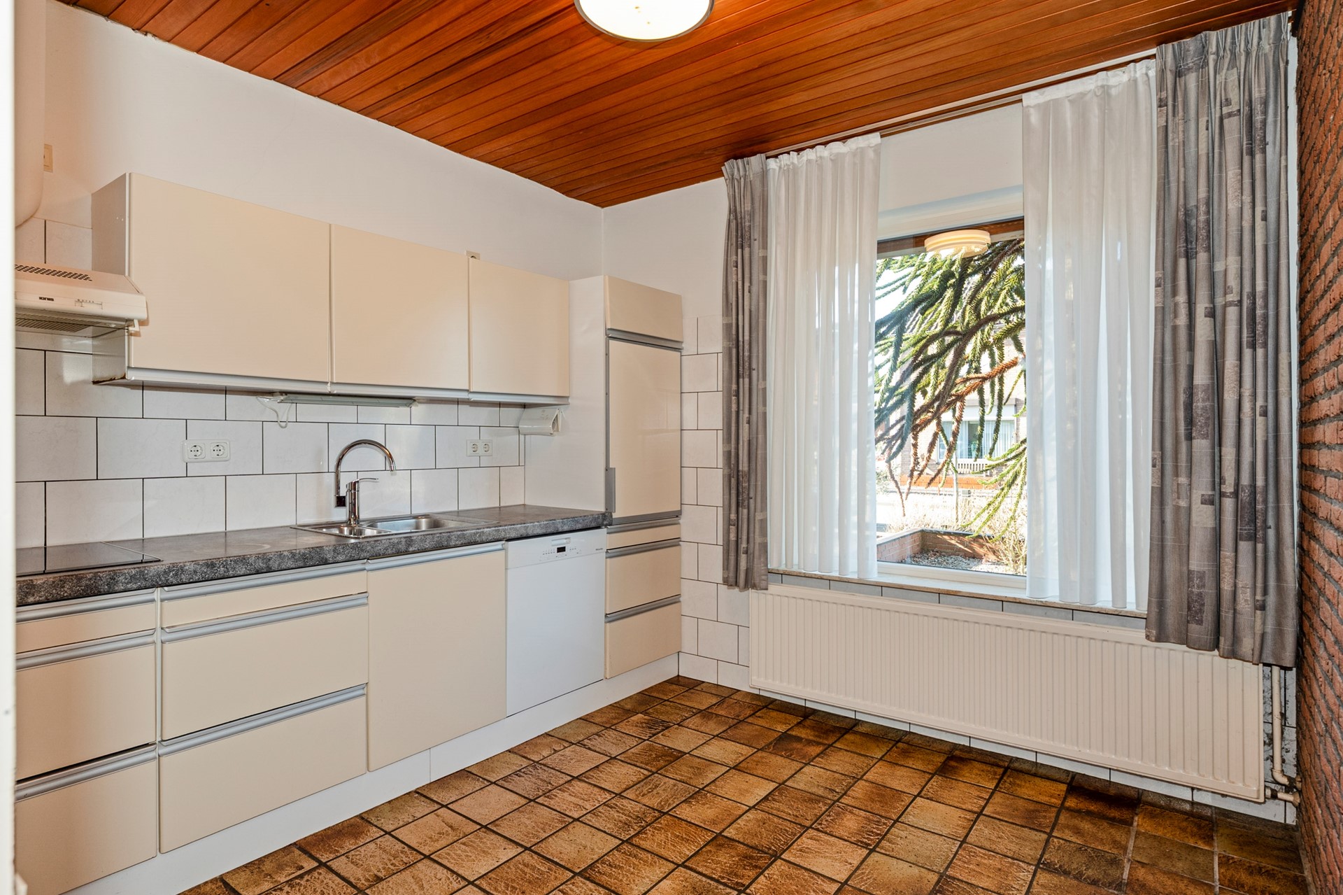 De keuken is gedateerd, echter voorzien van een 2 jaar oude vaatwasser en een +/- 10 jaar oude inductie kookplaat. Overige aanwezige apparatuur: afzuigkap, boiler, koelkast en spoelbak. De keuken is eveneens voorzien van een tegelvloer en schrootjesplafond.