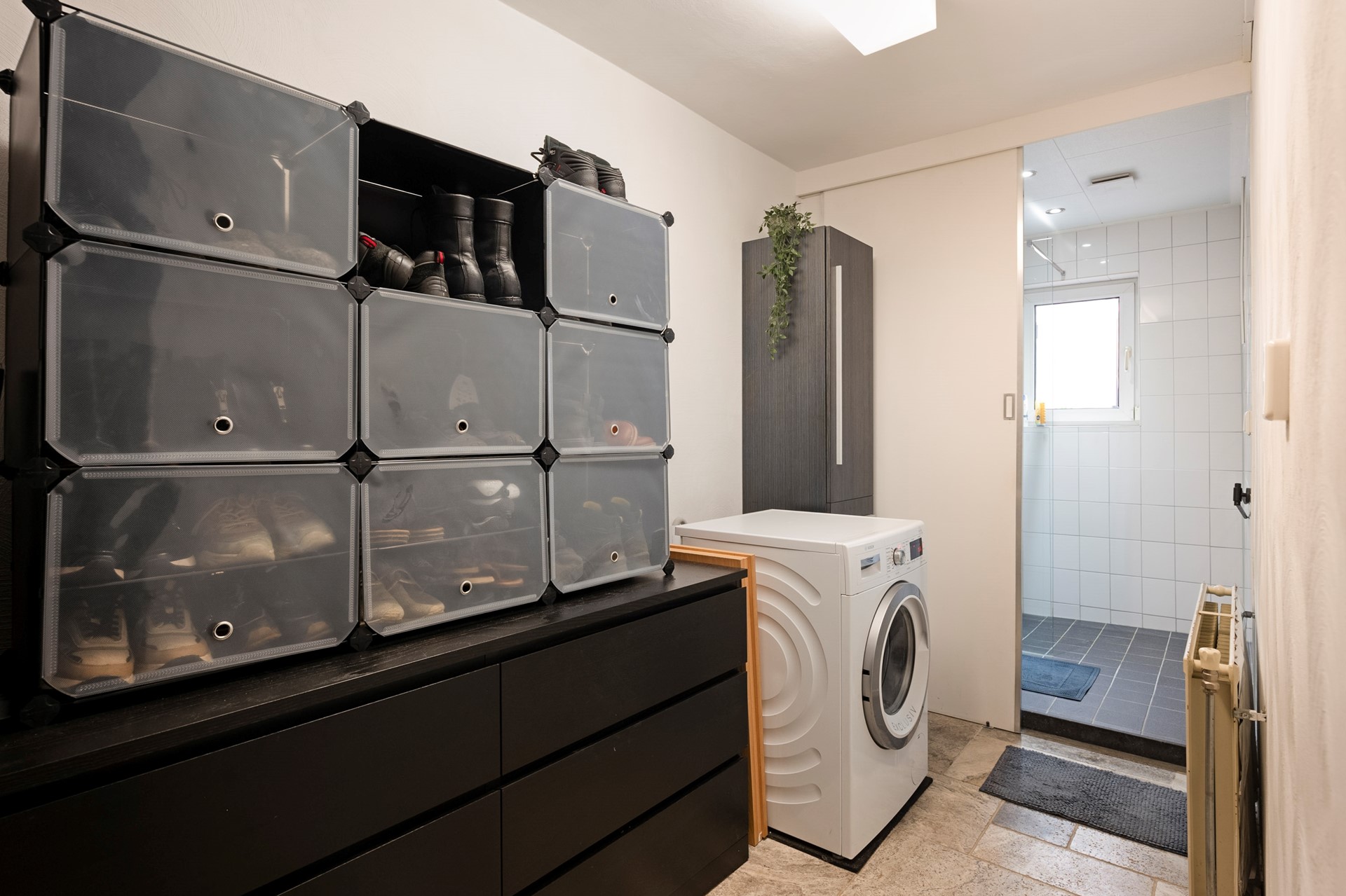 Bijkeuken/wasruimte voorzien van inloopdouche. Het aansluitpunt voor de wasmachine is hier gesitueerd.