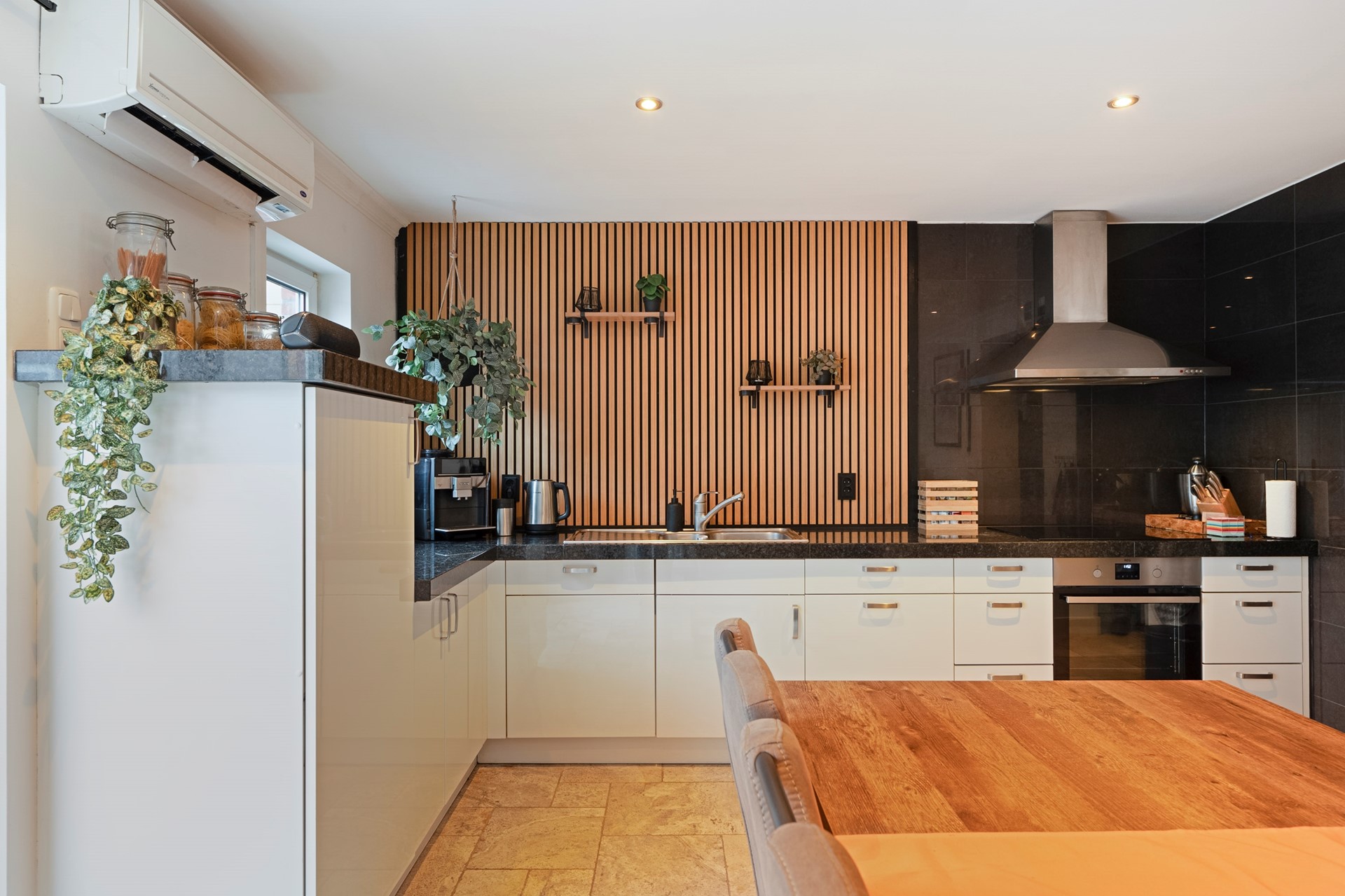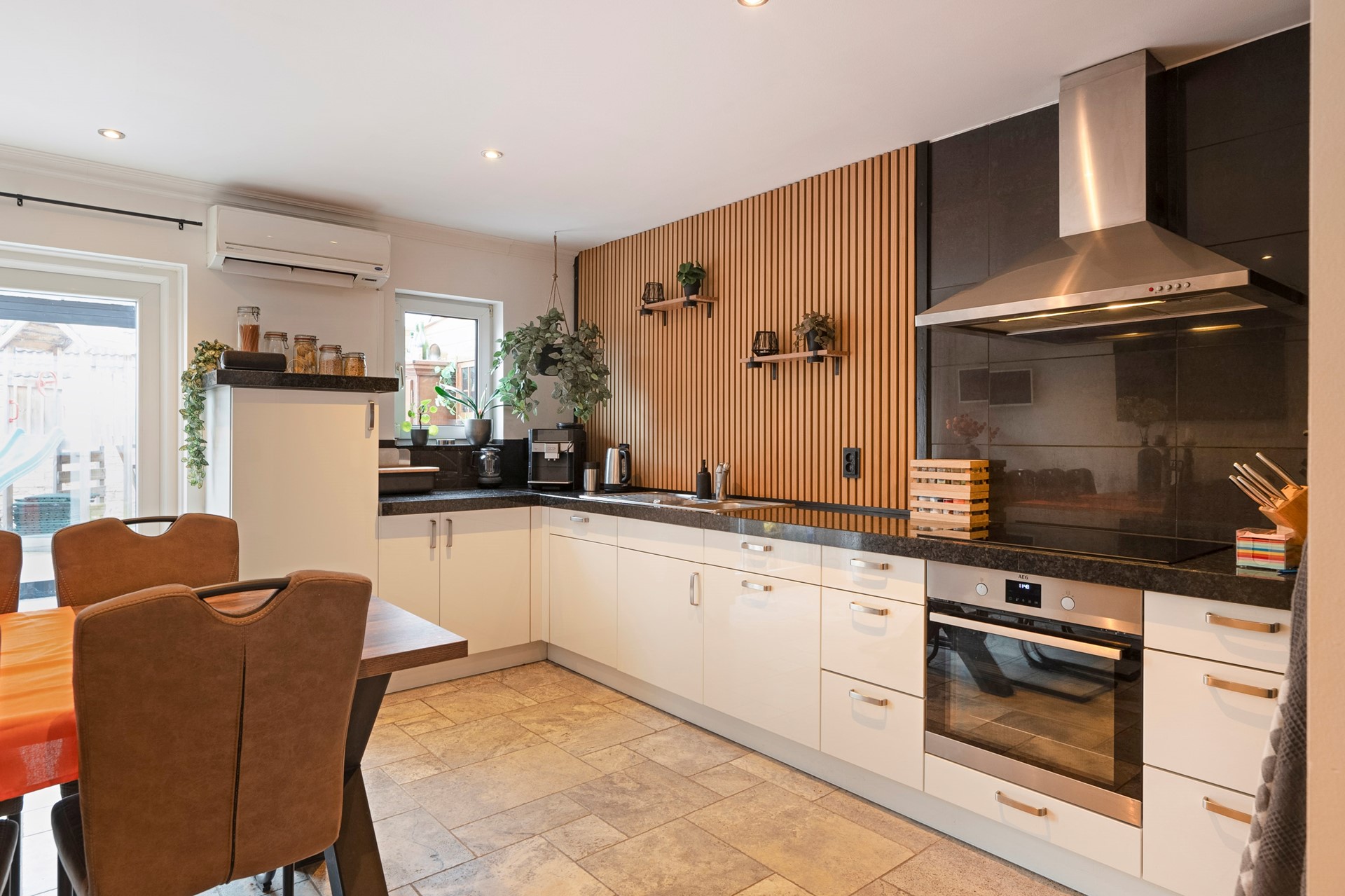 Semi-gesloten leefkeuken welke voorzien is van diverse inbouwapparatuur, te weten: (combi) oven, inductiekookplaat, afzuigkap, koelkast en een vaatwasser. In de keuken bevindt zich een airco-unit die zowel verwarmt als koelt. Vanuit de keuken is middels openslaande deuren de serre toegankelijk. De serre is smaakvol ingericht en door de schuifdeuren is er optimaal tuincontact. In de serre is een airco. Deze koelt alleen.