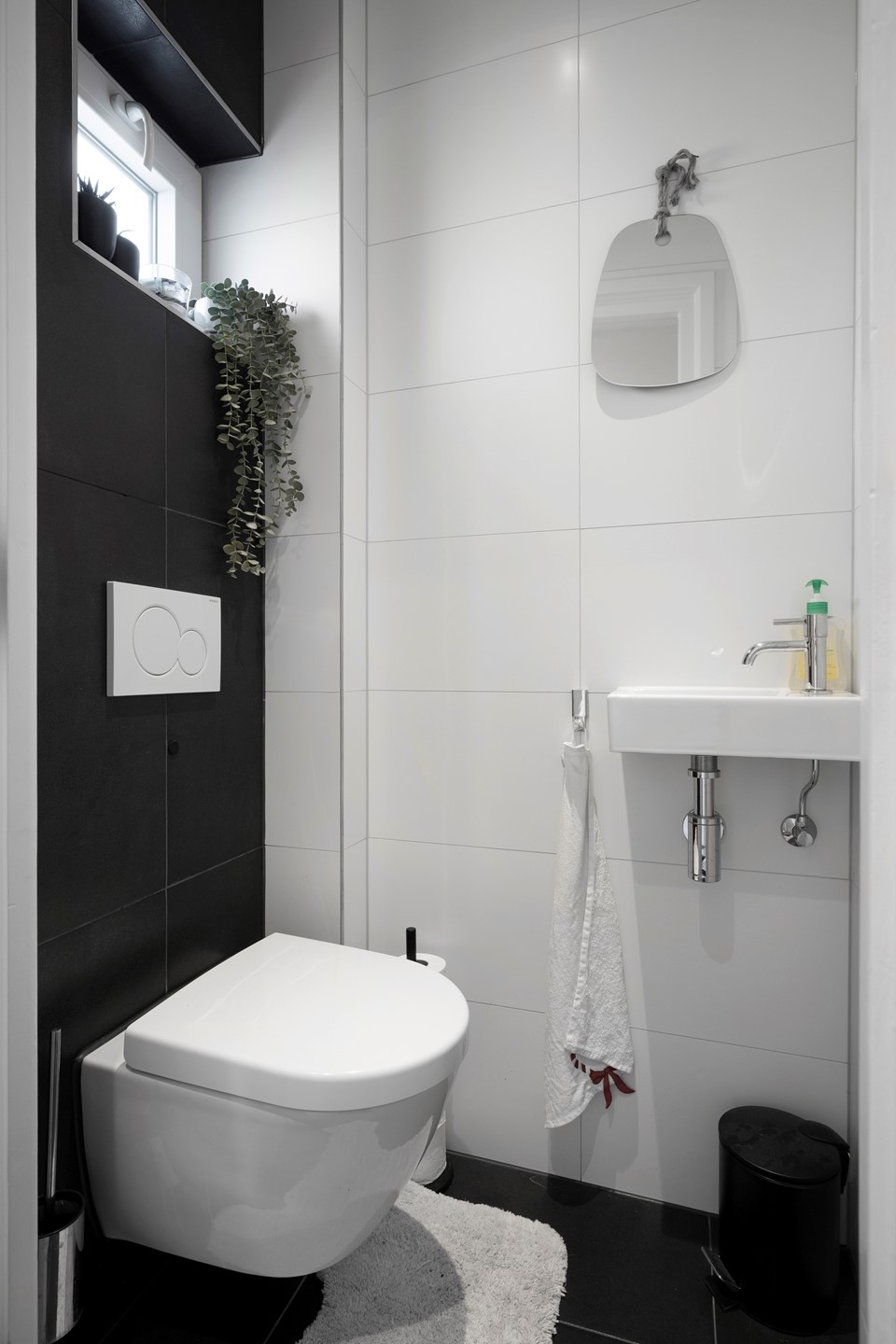 De moderne badkamer is voorzien van: een inloopdouche, wastafel met opbergmeubel en een toilet.