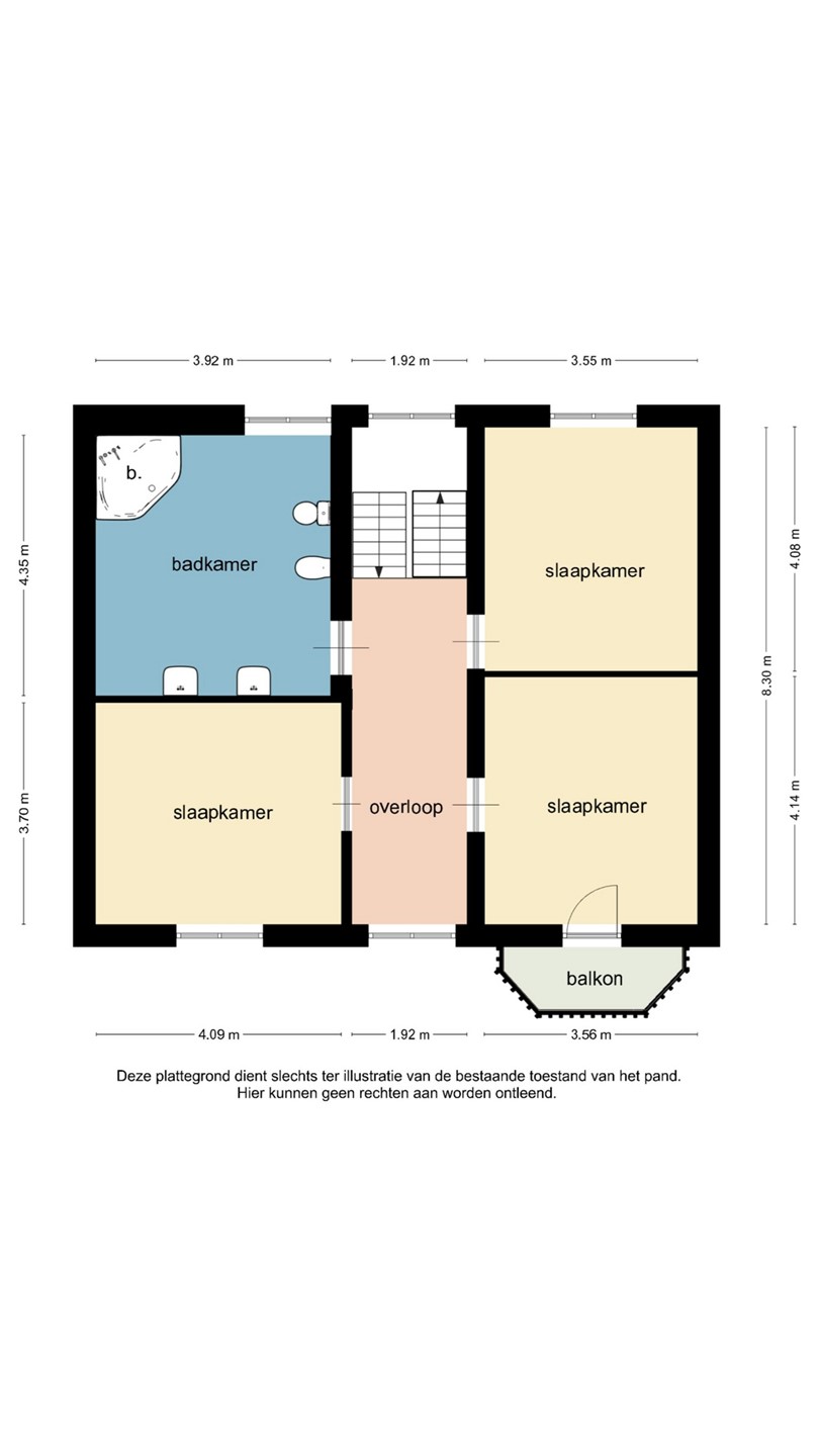 Brede overloop, 3 slaapkamers (waarvan 1 met balkon aan de voorzijde) en de badkamer.