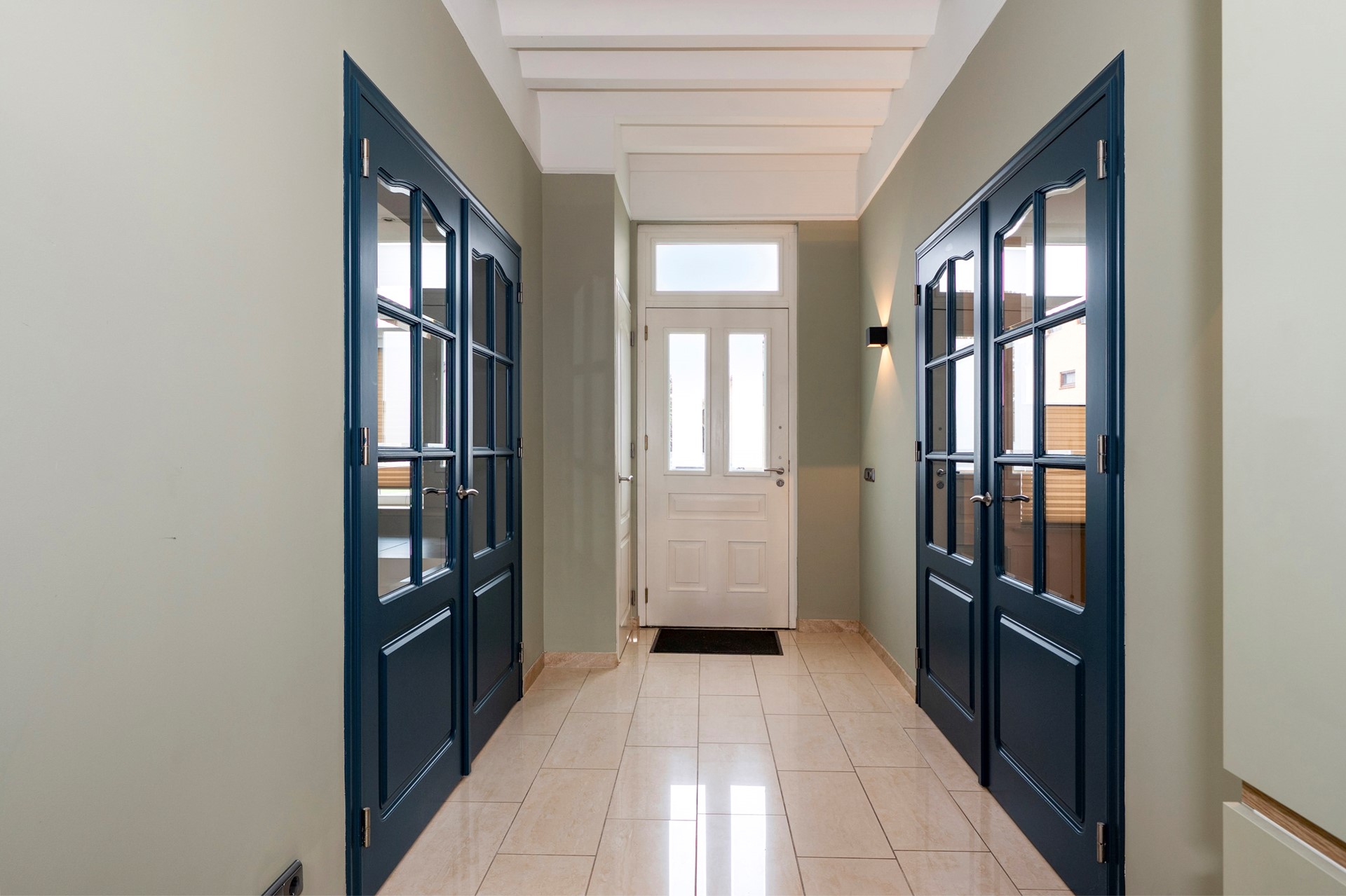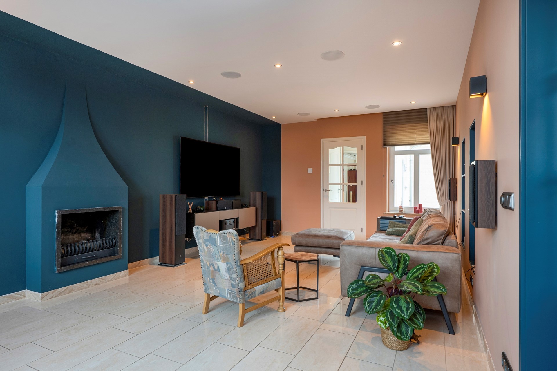 Ruime hal/entree, meterkast. De hal is voorzien van klassieke binnendeuren met glas. Dit zorgt voor een open verbinding van de ruimtes. De rechter kamer is momenteel in gebruik als multifunctionele ruimte. Dit is een zeer sfeervolle ruimte voorzien van een doorkijkhaard en een gezellige zithoek aan de voorzijde in de erker. Aan de linkerzijde bevindt zich de woonkamer met een open haard.