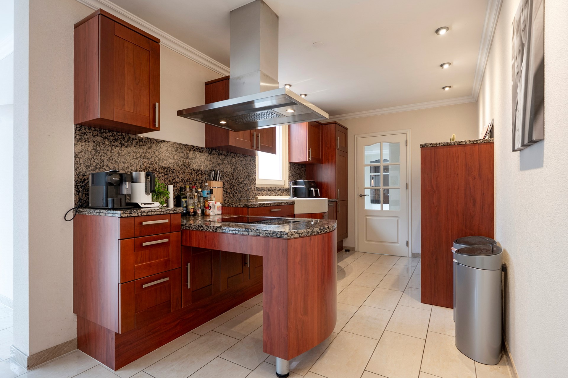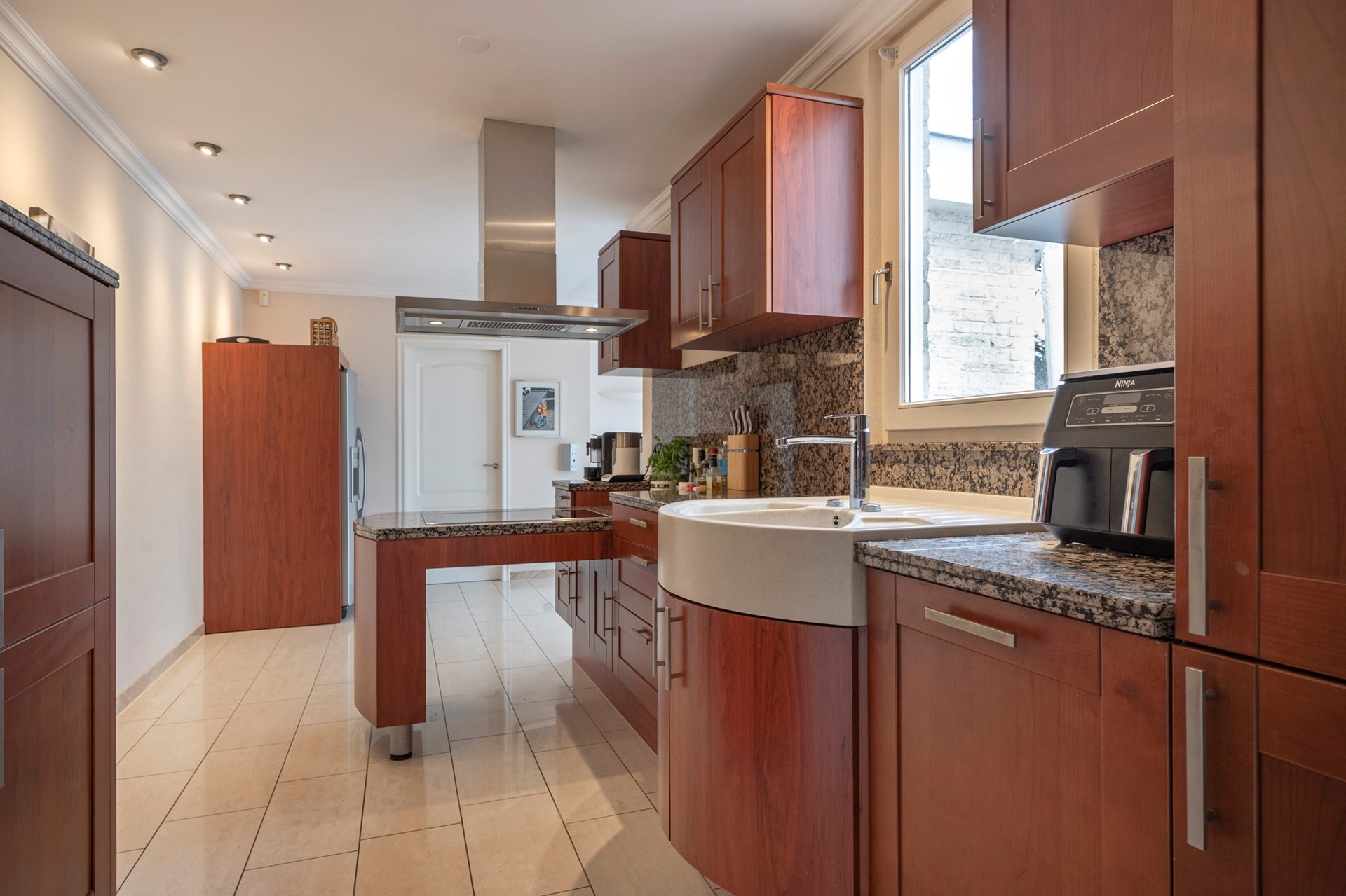 De keuken die in verbinding staat met de tuinkamer is voorzien van de volgende inbouwapparatuur: gootsteen met dubbele spoelbak, koelkast, inductiekookplaat, afzuigkap en een vaatwasser.