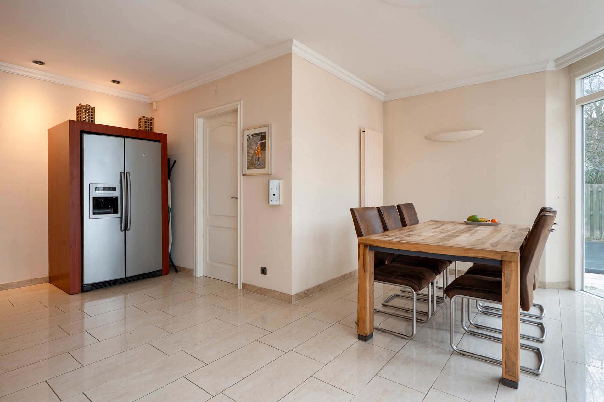 In het verlengde van de keuken bevindt zich de sfeervolle tuinkamer met openslaande deuren naar de heerlijke tuin. Door de aanwezigheid van de grote raampartijen is deze ruimte voorzien van veel lichtinval. Vanuit de tuinkamer is de bijkeuken/ witgoedruimte bereikbaar.