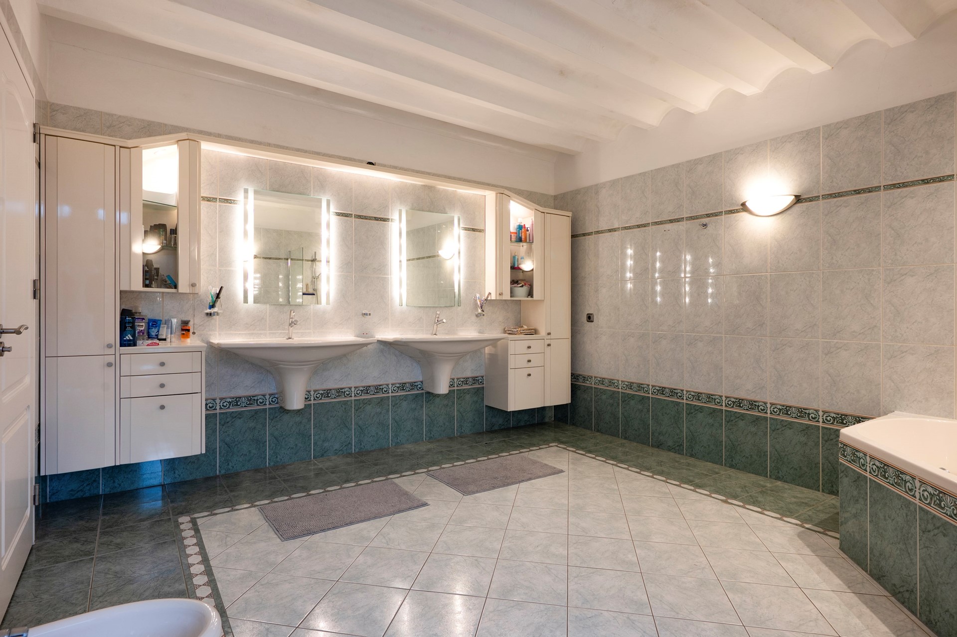De ruime badkamer is voorzien van een hoekbad, 2 wastafels met opbergruimte, toilet en een bidet.